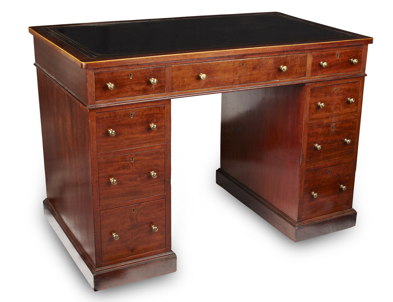 the rounded rectangular top with an inset tooled leather writing surface, above three frieze drawers, the pedestal supports each with three further drawers and raised on plinth bases
