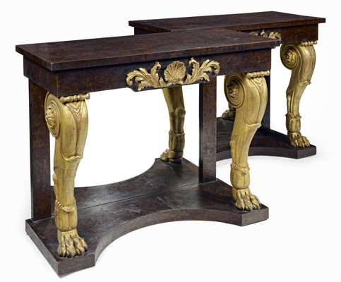 PAIR OF REGENCY STYLE SIMULATED BURRWOOD AND PARCEL GILT CONSOLE TABLES