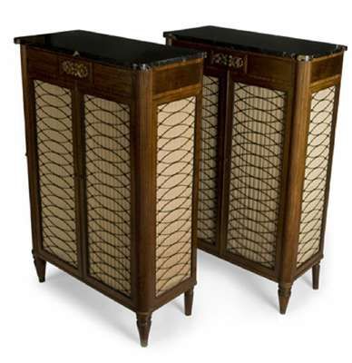 each with an ochre veined black marble top with projecting corners above a frieze inlaid sans travers and mounted with an ormolu anthemion to the central tablet, the pair of doors framed with ebony beading and decorated with curved brass trellis work backed by pleated silk and enclosing fixed shelves, the sides of conforming design, on reeded uprights and toupie feet ending in brass caps (restorations) (2)