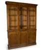 the cavetto moulded cornice above three glazed panel doors enclosing adjustable shelves, the lower section with three further arched panel doors, raised on a plinth base