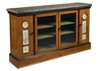 the later marble top above two central glazed panel doors, flanked by two further panelled cupboard doors inset with Sevres style porcelain plaques depicting cherubs and foliage, opening to reveal lined shelved interior, raised on a plinth base