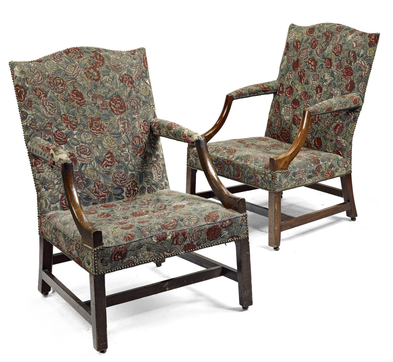 the serpentine shaped backs, padded downswept arms and stuffed over seats covered in foliate tapestry, raised on square chamfered legs united by H-stretchers