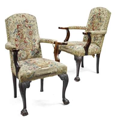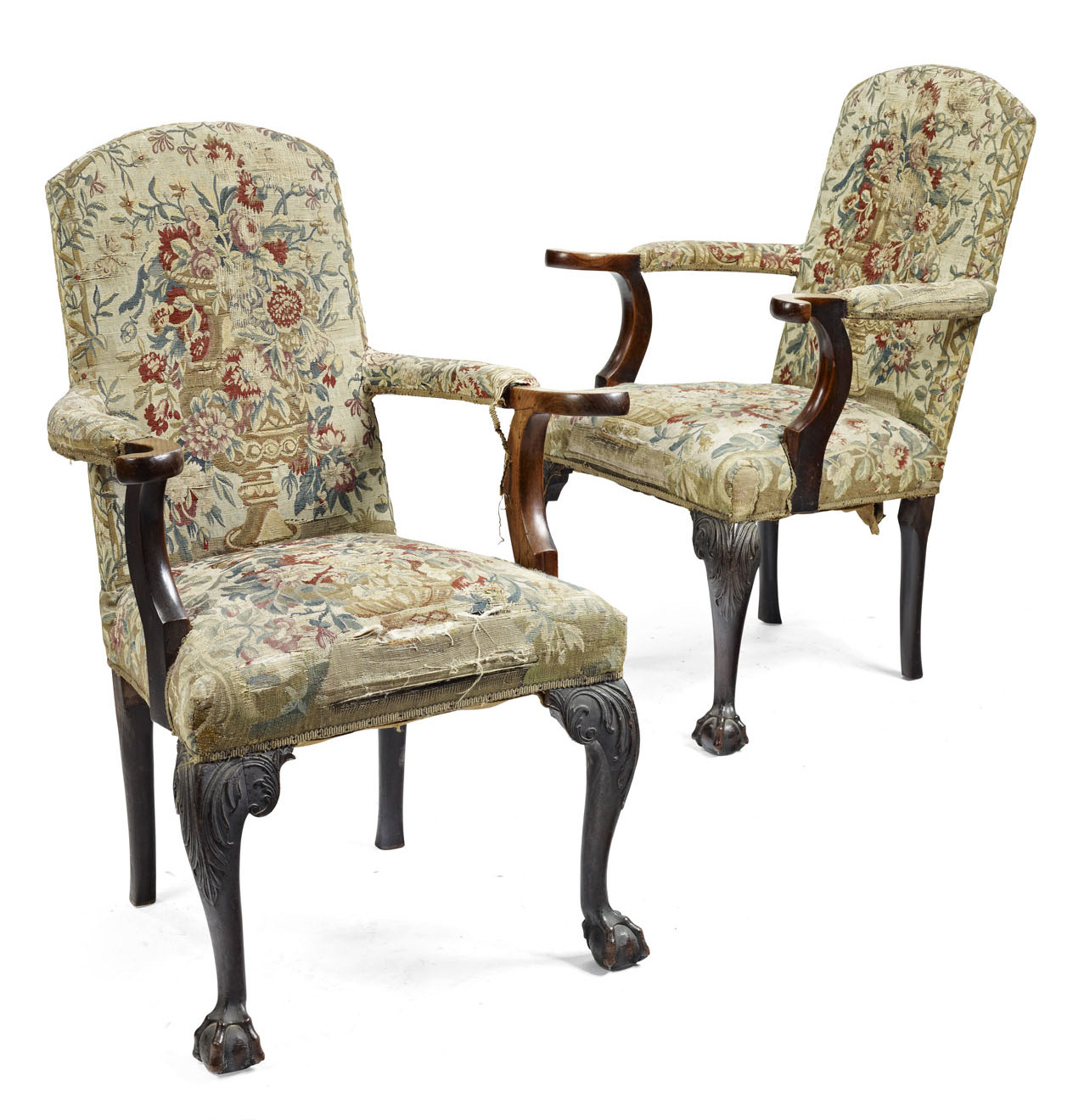 with later arms, the arched backs and stuffed over seats covered in foliate tapestry, raised on acanthus carved cabriole legs ending in claw and ball feet