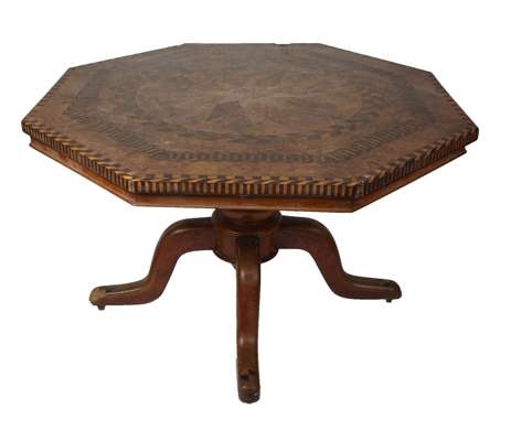 the parquetry veneered octagonal top raised on a bulbous turned column support ending in four cabriole legs
