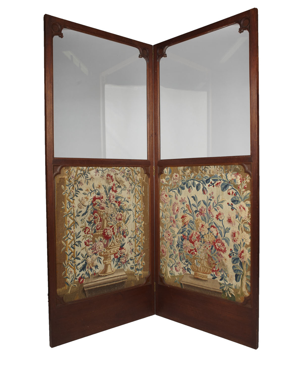 each with one glazed panel over a foliate tapestry inset apron panel