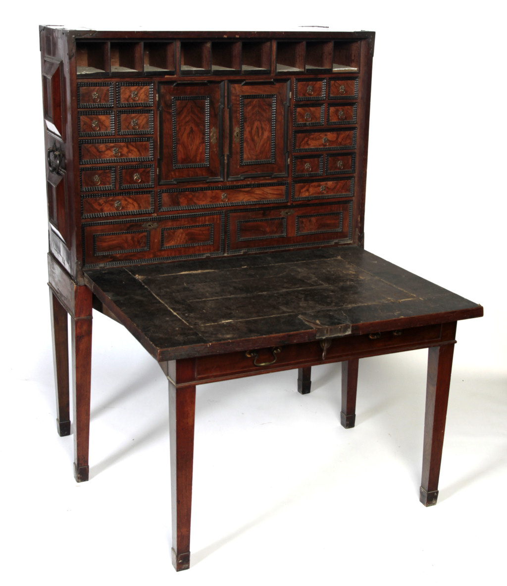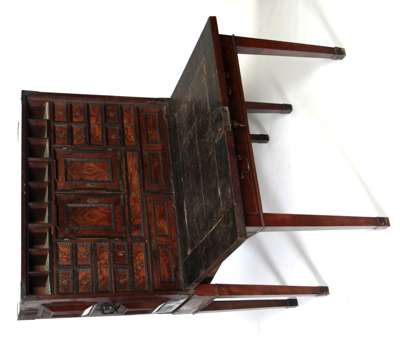 the mitre moulded fall front enclosing a fitted interior with an arrangement of pigeon holes, drawers and central cupboard doors, raised on an associated adapted stand
