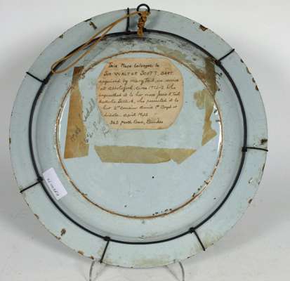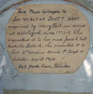 Note: bears old label to the reverse 'This plate belonged to SIR WALTER SCOTT, BART acquired by Mary Tait, in service at Abbotsford, circa 1821-2 who bequeathed it to her neice Jessie H Tait, Heatherlie, Selkirk, who presented it to her 2nd cousin Annie P Boyd or Liddle, April 1932, 362 Perth Road, Dundee.'