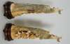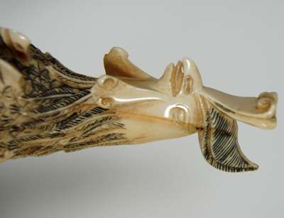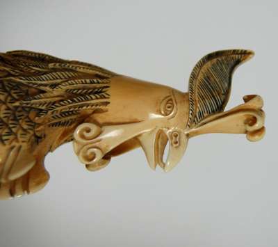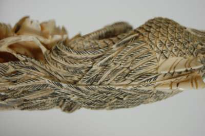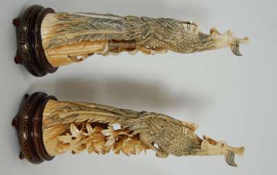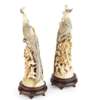 each seated on a profusely carved cascade of flowers and with stained and carved feathers and a long tail, on a fitted white metal inlaid wood stand (2)