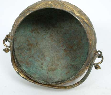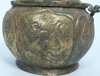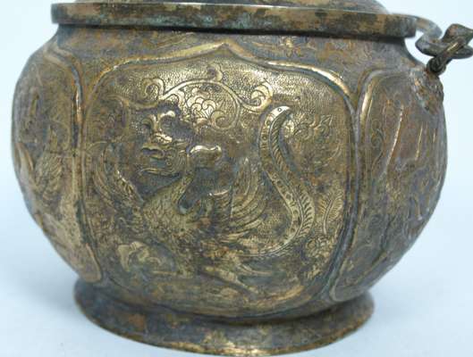 of globular form with splayed foot and swing handles with flower bud terminals, the cover with three dragon-carp handles and decorated with stylised leaves and central flowerhead, the body with a continuous band of cartouche panels each repousse decorated with a dragon or pheonix surrounded by foliate scrolls, on an allover ring-punch ground