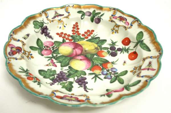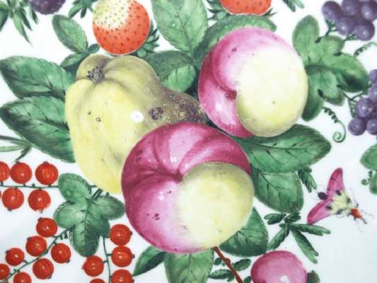 of lobed form, painted in polychrome enamels with peaches, a pear, cherries, black grapes, and redcurrants, the border decorated with butterflies within feuille-de-choux borders, the scalloped rim highlighted with turquoise line, gilt painted crescent mark