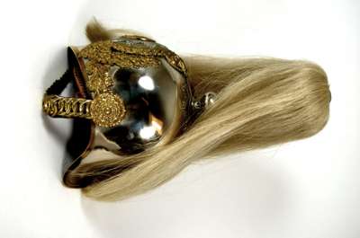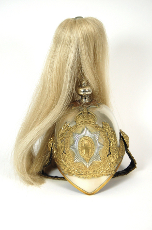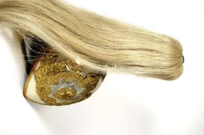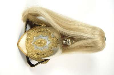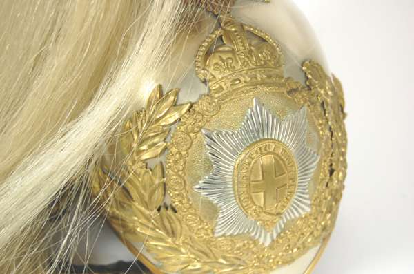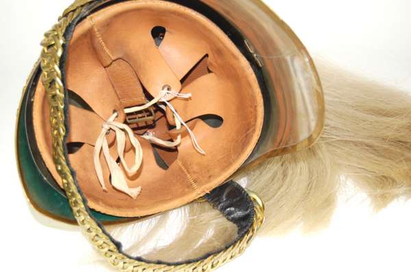 of traditional form with white horsehair plume, large front garter star badge with the royal motto surmounted by the royal crown, with two rosettes at the junction of the chin-strap at each side, with the adjustable leather inner liner