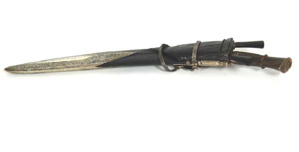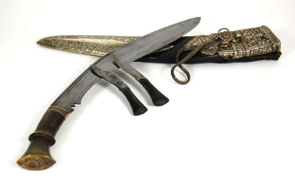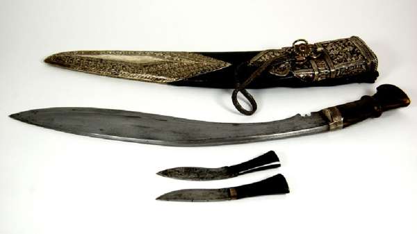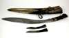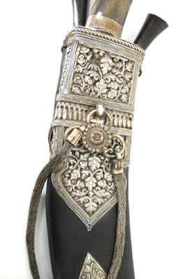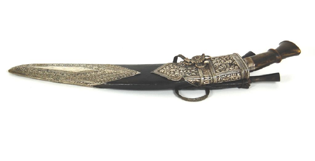 the curved blade of traditional form with sharpened single edge, the grip of horn with brass pommel, with two bye knifes with horn grips all contained in a black leather decorated silver mounted scabbard