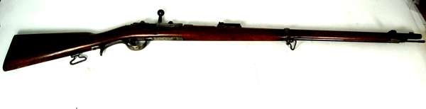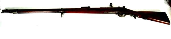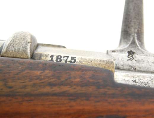 the lock struck with VR crowned, 27 inch smooth bore barrel with Birmingham proof and view marks at the breech, full walnut stock with brass furniture, with two barrel bands with retaining catches and original steel ramrod; together with a 19th century German military bolt action Mauser rifle, 1875 pattern, three stage rifled barrel octagonal at the breech with folding sight, full walnut stock, steel spurred trigger guard and butt plate with original steel ramrod, 48 inches (123cm) long (2)