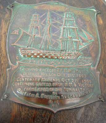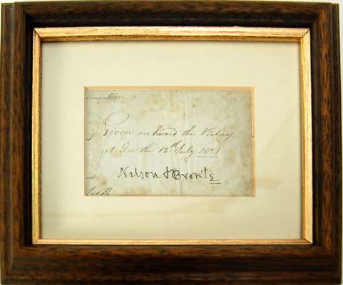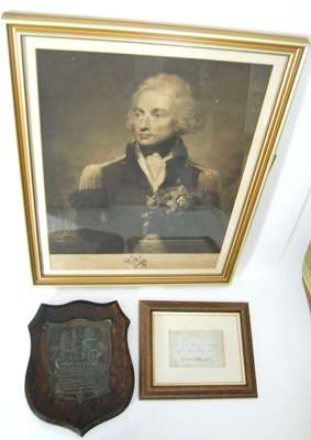 in later frame, 43cm x 53cm; his framed signature to a fragment document; and a 1905 presentation plate pressed from copper taken from HMS Victory depicting the flag-ship on an oak shield (3)