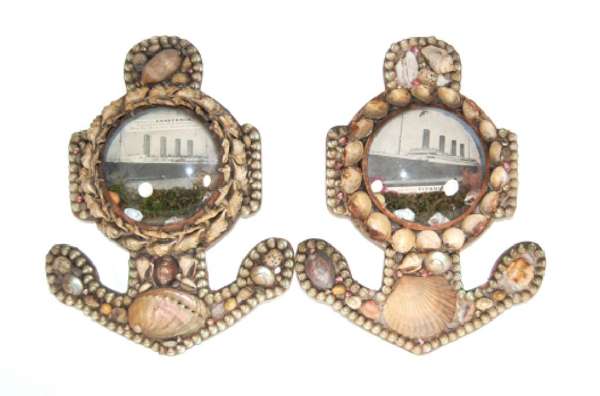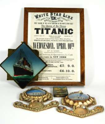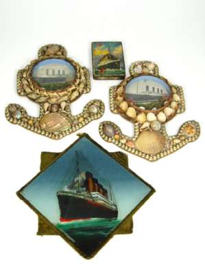 for third class passengers, 44cm x 34cm; with related White Star Line suitcase; souvenir framed picture of the Titanic and Lusitania in matching shell decorated frames; a souvenir star shaped hanging picture of the Titanic; and a White Star Line cigarette box (6)