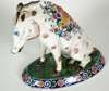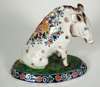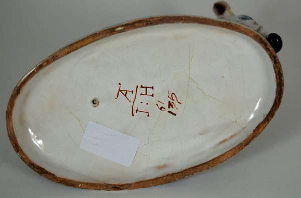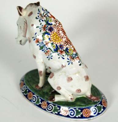 decorated with polychrome flowers to his back and raised on an oval plinth with a border of stylised flowers and scrolls, painted marks to underside