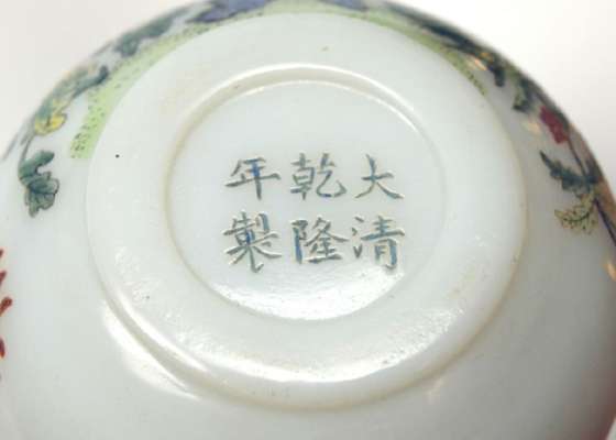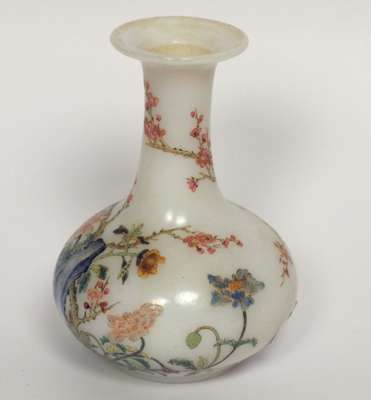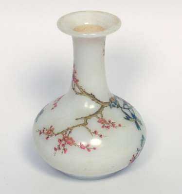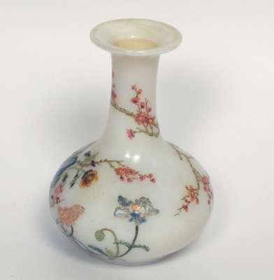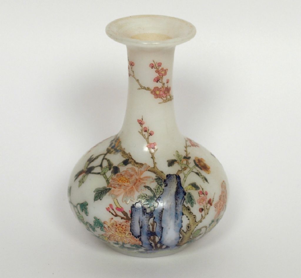 with everted rim above long neck and slightly flattened globular body, painted with rockwork, chrysanthemums, peony and prunus blossom, incised mark to base