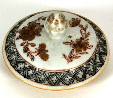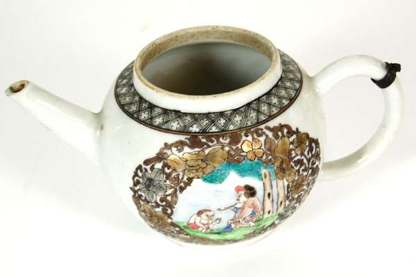 CHINESE EXPORT POLYCHROME PAINTED TEAPOT, COVER AND SPOON STAND