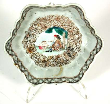 each decorated with a European man and child seated in a forest with a dog, framed by a profusely scrolled gilt and brown painted floral frame, the teapot of globular form, the stand of scalloped hexagonal form