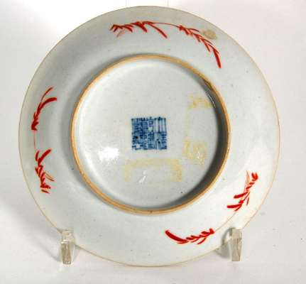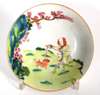 decorated with a European man walking a small dog in a landscape with rockwork and tree