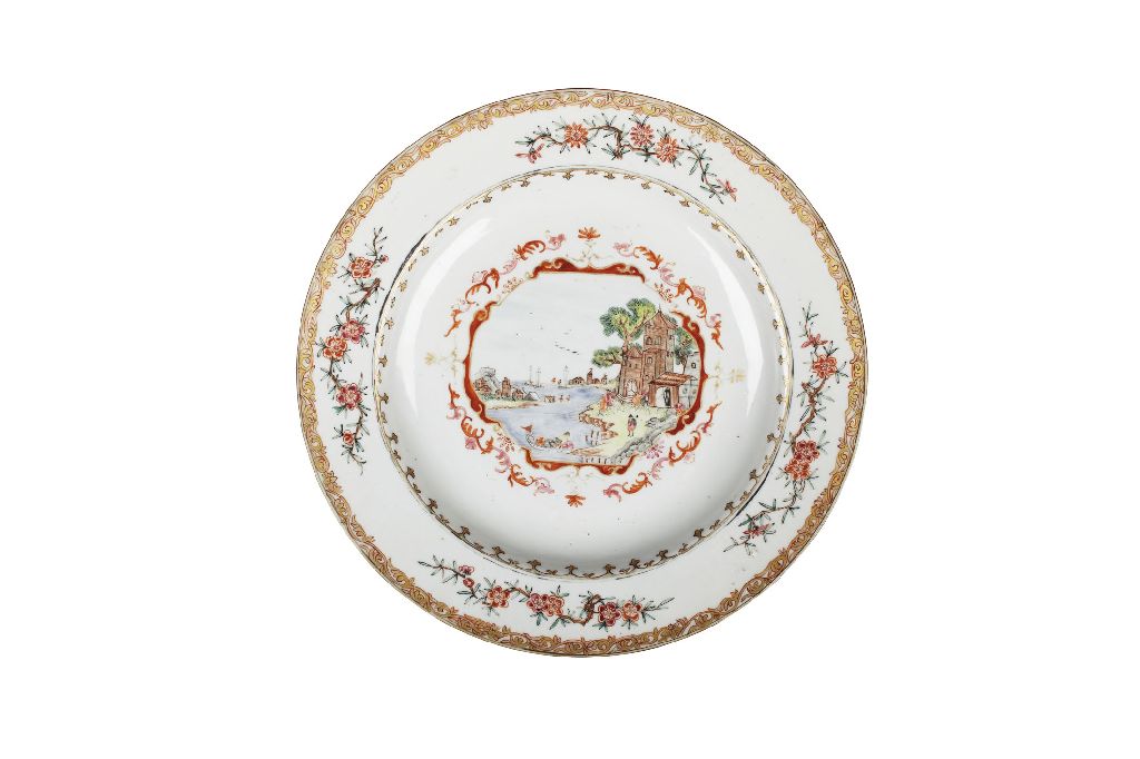 each decorated with foliate scrolls to the rim, prunus blossom to the border, the well with a riverine landscape scene with European buildings and Chinese figures (12)