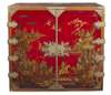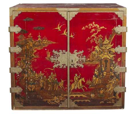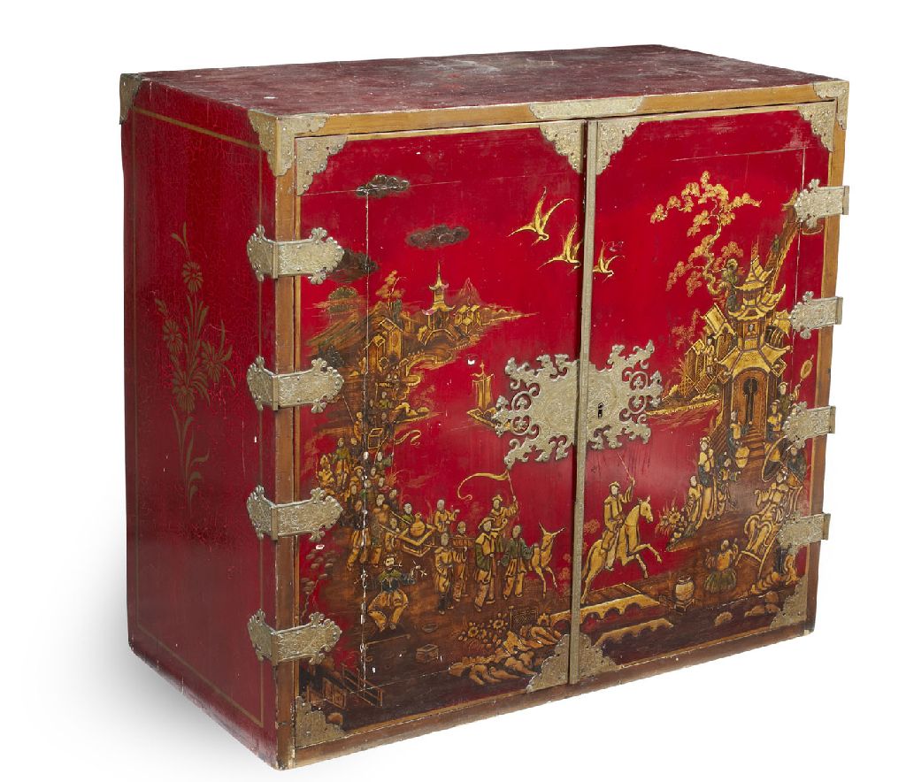 the figural chinoiserie decorated doors enclosing a decorated cream fitted interior