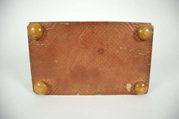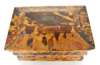 of rectangular bombe form, the hinged lid enclosing a lidded compartmented interior, raised on squat bun feet