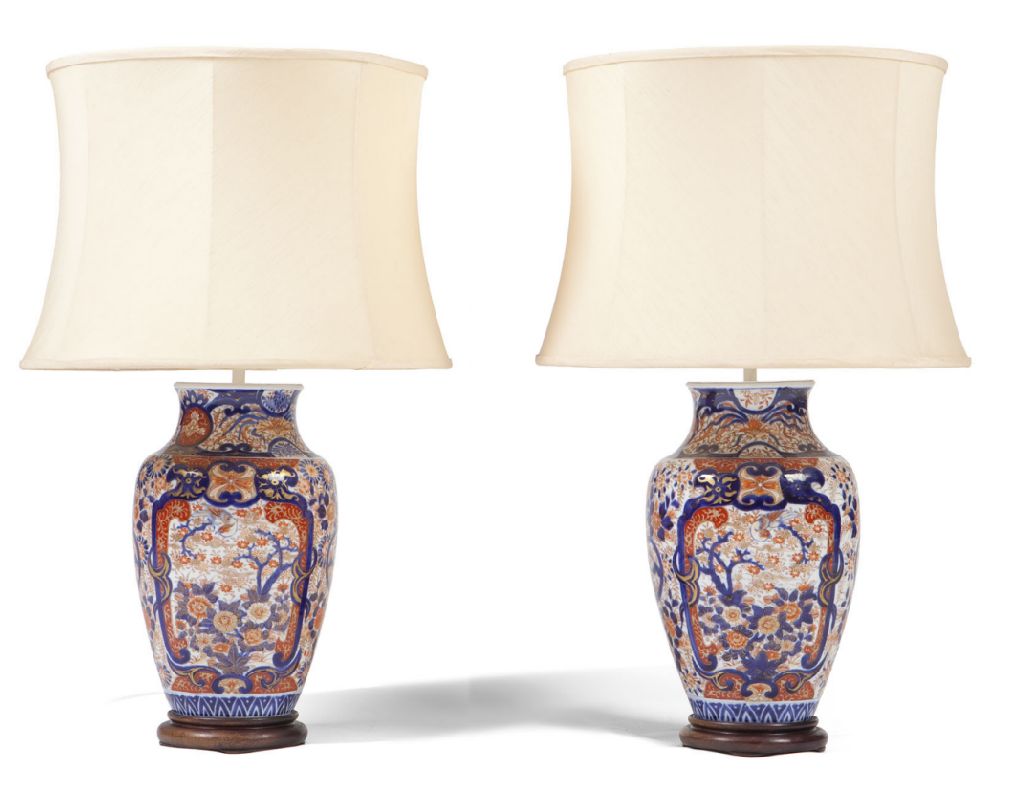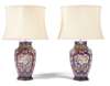 of shouldered ovoid form, profusely decorated with flowers, trees and birds, converted to lamps (drilled) (2)