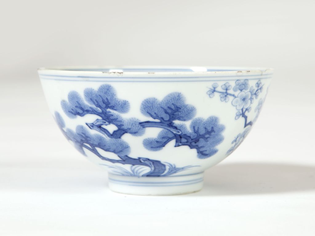 decorated to the exterior with bamboo, pine and prunus, blue painted character mark to base