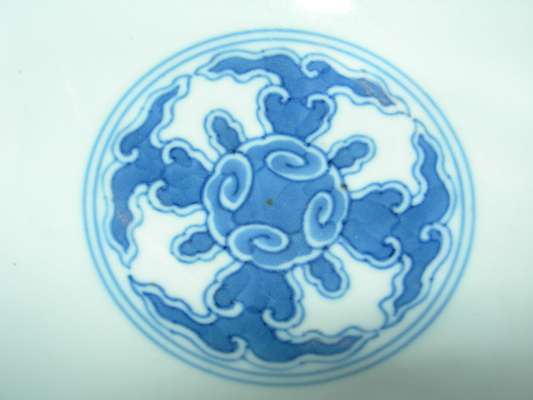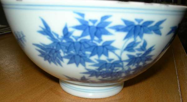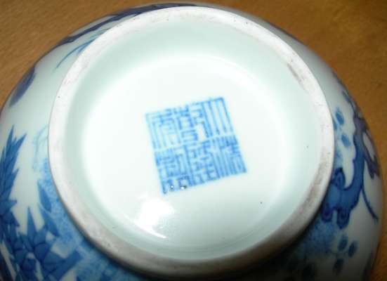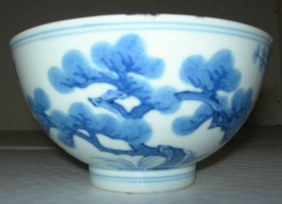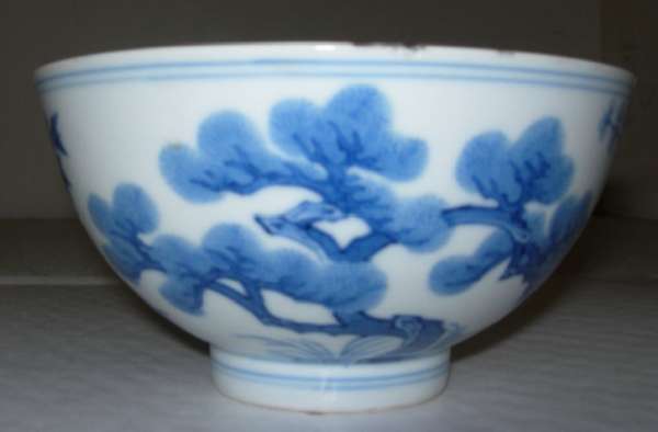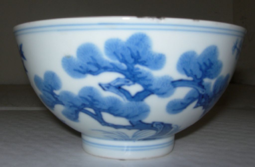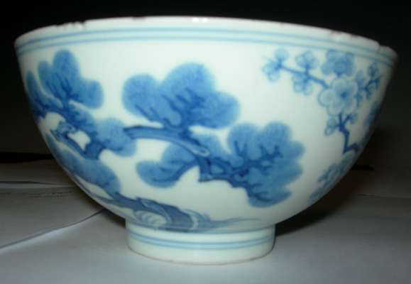 decorated to the exterior with bamboo, pine and prunus, blue painted character mark to base