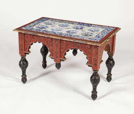 the rectangular top inset with Delft blue and white tiles, above an arcaded frieze, raised on baluster turned legs