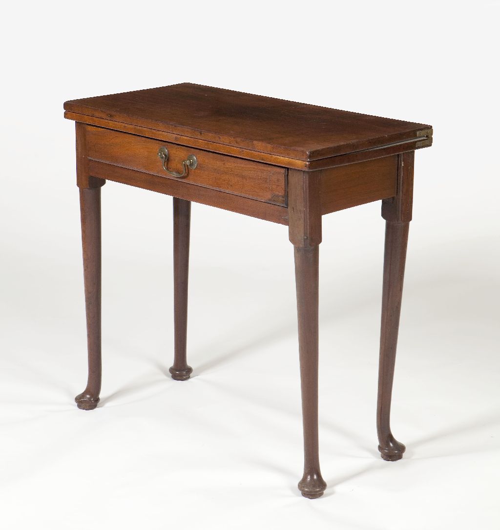 the foldover rectangular top above one long frieze drawer raised on turned tapered legs ending in pad feet