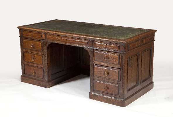the rectangular top with an inset green leather writing surface above three frieze drawers, the pedestal supports each with three further drawers, raised on plinth bases