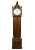 the white painted dial with subsidiary second and date dials, the 8-day movement striking on a bell, the arched hood with spire finials, above a conforming arched door and canted corners, raised on a plinth base