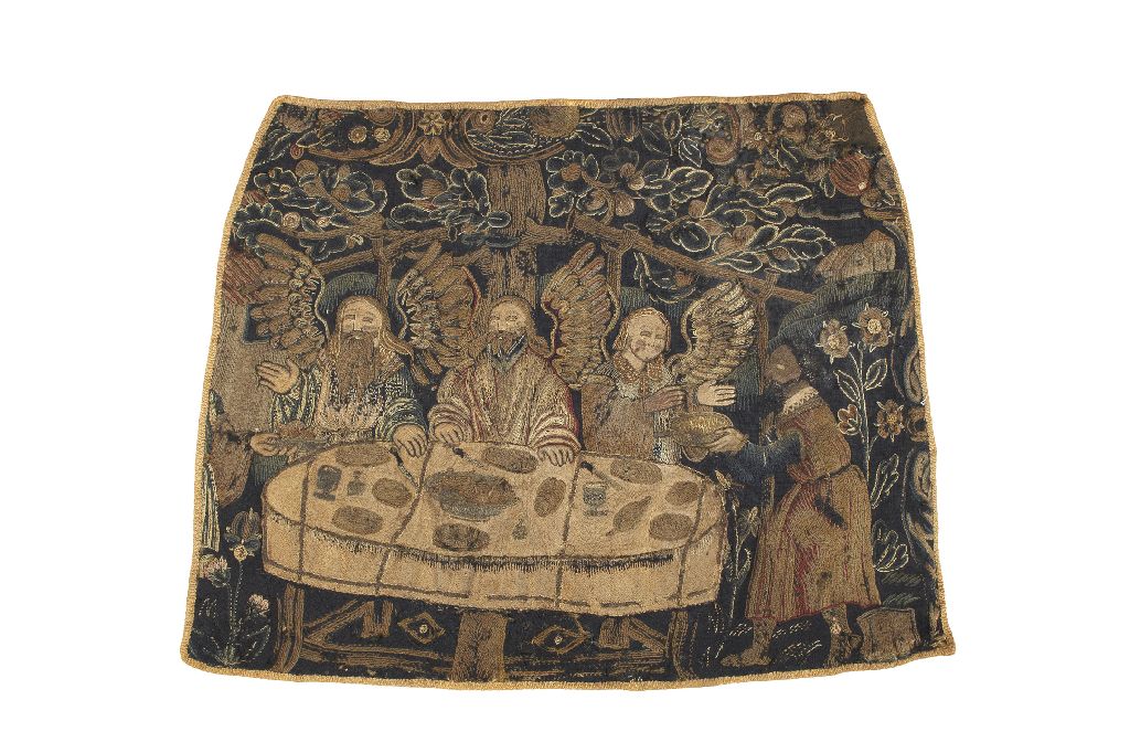 woven in wool with Abraham Entertaining The Three Angels (Genesis 18:1-16), the angels seated at a table beneath foliage, Abraham to one side, black ground