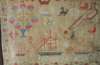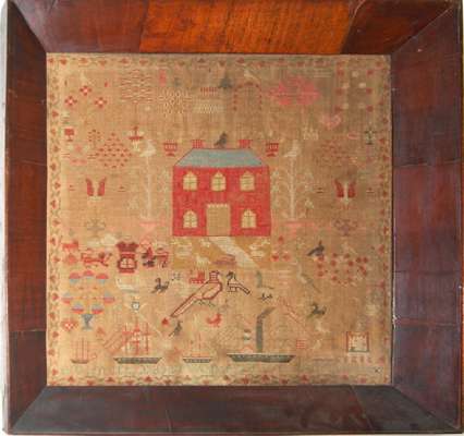 woven in wool with birds, animals, ships and foliage, centred by a red brick house, inscribed 'Prudence Lloyd Her Work, A-Z, 1836', in mahogany frame and glazed
