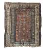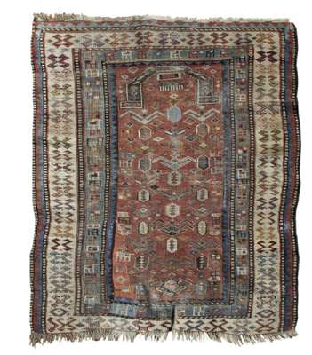 the brick red field with brown bar mihrab and various stylised motifs, within ivory hooked X border with inner green dog band, outer pyramid band (worn)
