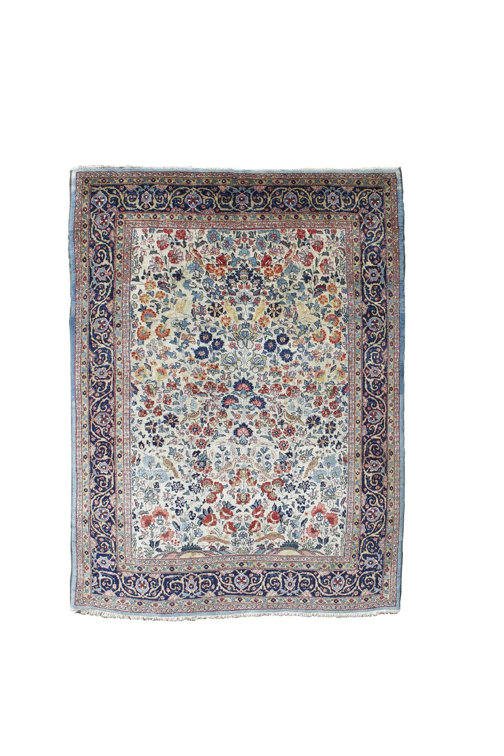 the cream field with allover floral vine and bird pattern, within indigo scrolling vine and palmette border between ochre bands