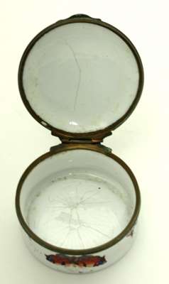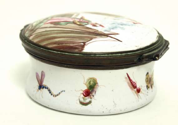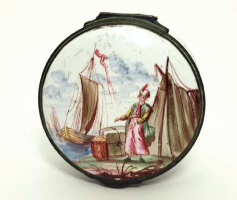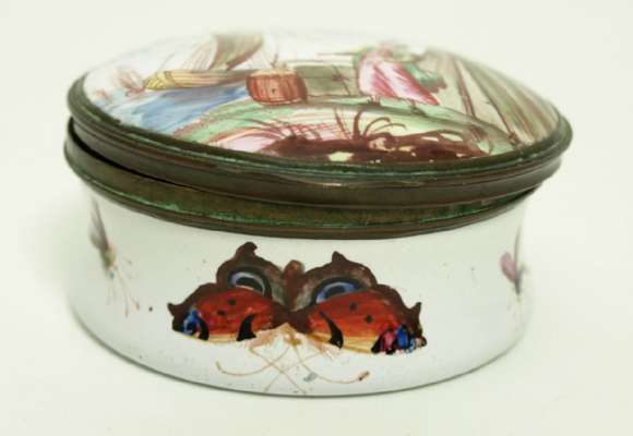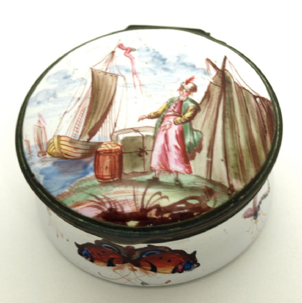 of circular waisted form, the cover decorated with an exotically dressed figure by a tent on the shore with sailing boats, the sides and base decorated with colourful butterflies and insects