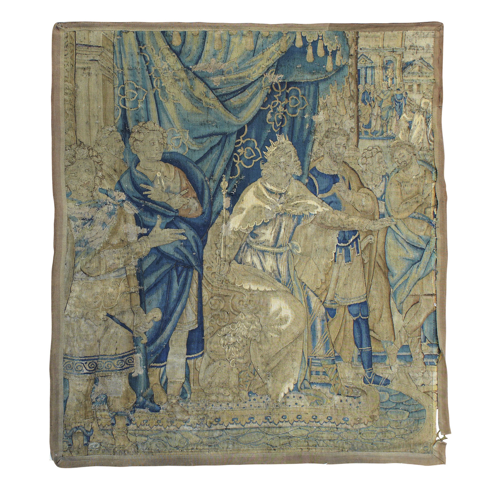 woven with a king seated on a throne under a blue cloth canopy, courtiers standing to each side, later plain band border (reduced)