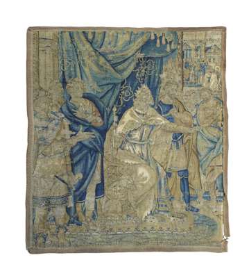 "A portion of a large subject which belongs to a very fine set of Old Testament scenes in the Imperial Collection at Vienna. The whole subject represents the jews negotiating with Solomon. The original set was woven at Brusseles [sic] in the 16th century; this piece is later, possibly 17th century, as the designs went on for some time"