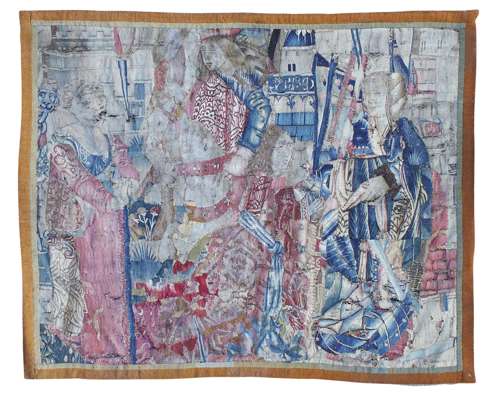 woven with two knights bidding farewell to two ladies in pink and blue dresses, castle in background, later plain band border (reduced, patched)