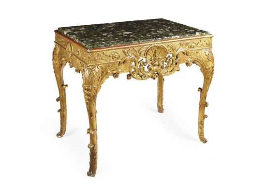 the inset green marble top above an ornate pierced, foliate and shell carved frieze, raised on shell and acanthus carved cabriole scroll legs