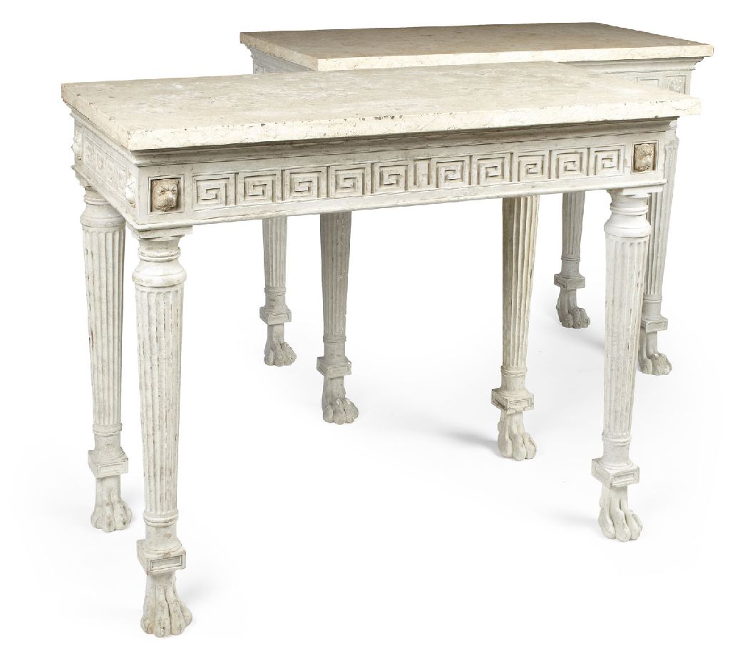the veined marble tops above Greek key moulded friezes, raised on fluted turned tapered legs, surmounted by lions' mask motifs and terminating in carved paw feet (2)