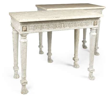 PAIR OF ADAM STYLE PAINTED MARBLE TOP CONSOLE TABLES