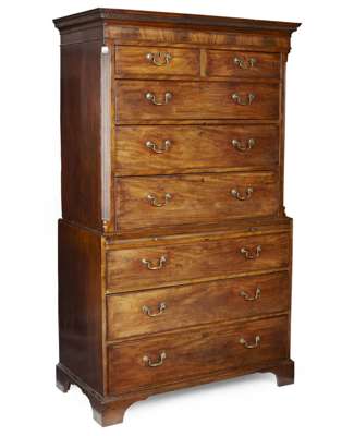 the Greek key moulded cornice above two short and three long graduated drawers, the lower section with a brushing slide over three further long drawers, raised on bracket feet
