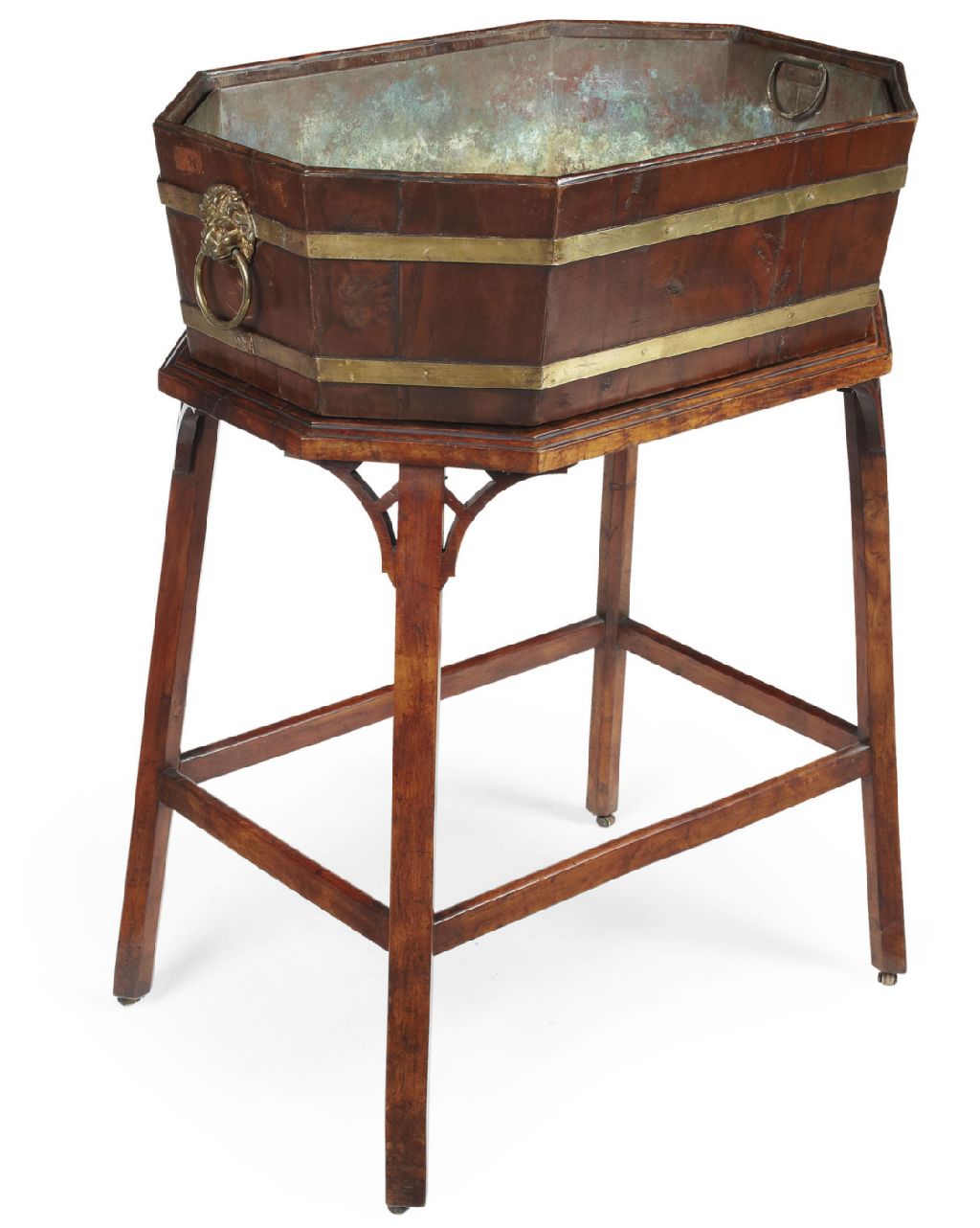 of hexagonal form, the sides with lions' mask and loop carrying handles, the stand with splayed square chamfered legs united by peripheral stretchers