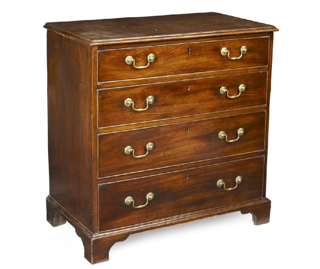 the moulded rectangular top above four long graduated drawers, raised on bracket feet