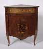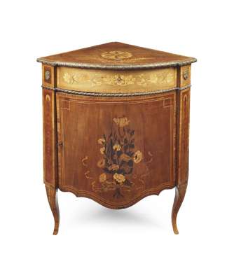 LOUIS XV STYLE MAHOGANY AND MARQUETRY BOWFRONT ENCOIGNURE