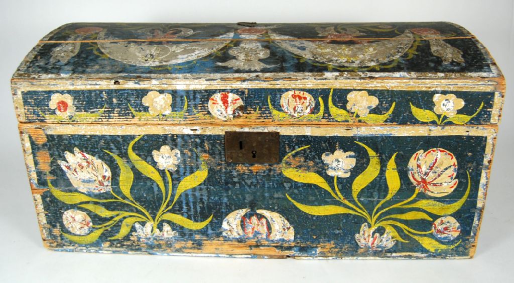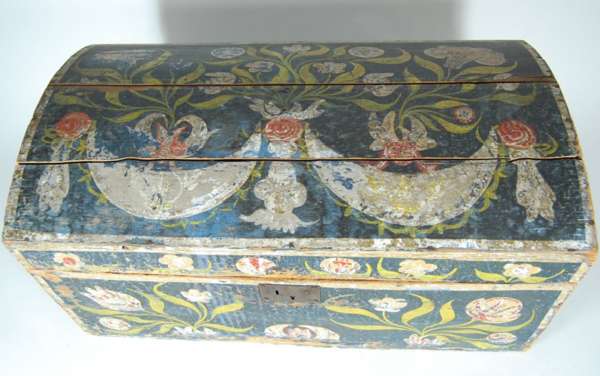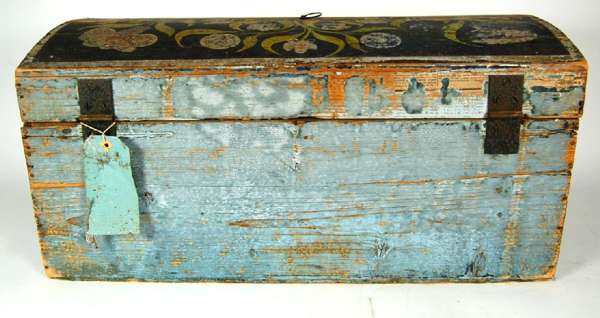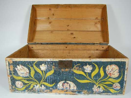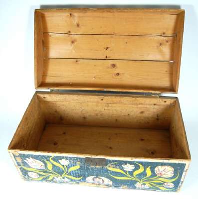 the hinged lid and sides painted with scrolling foliage against a blue ground, within a white border